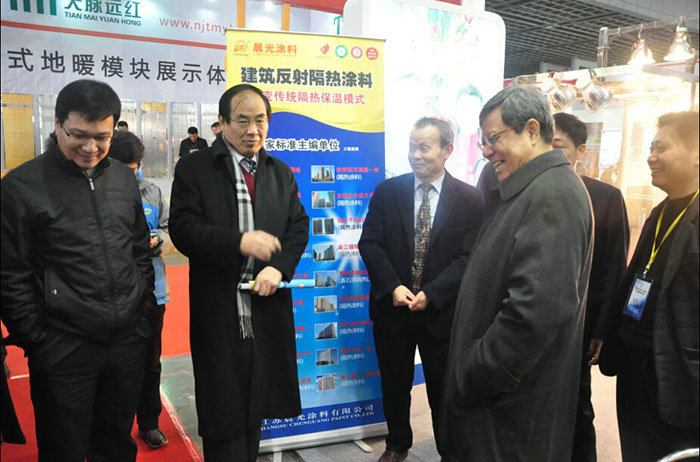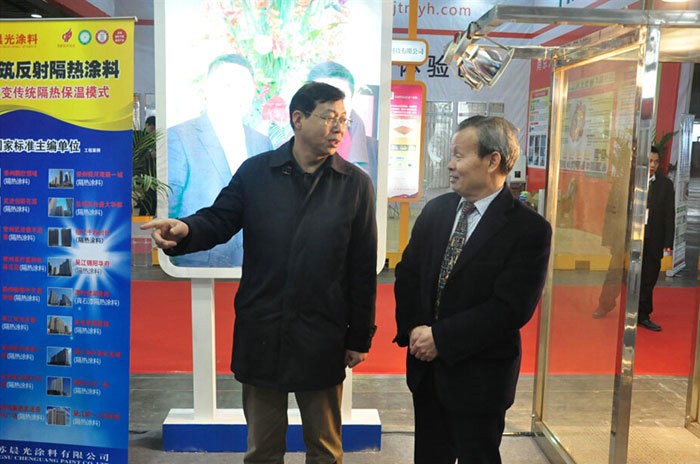 国家住房和城乡建设部科技与产业发展司,江苏省墙体改革办公室12月19~21日在中国南京国际展览馆主办了中心城市2014首届夏热冬冷地区绿色建材展览会,原建设部党组成员,副部长,现全国节能协会会长郑坤生,住建部科技产业司韩司长,江苏省住建厅黄处长,南京市墙改办等领导到会祝贺,由江苏PA视讯在线官网涂料有限公司发明的建筑反射隔热涂料保温系统在开幕式当天受到了郑坤生部长等领导的参观视察。