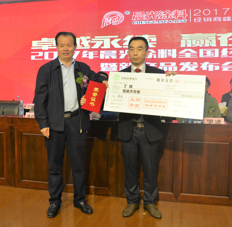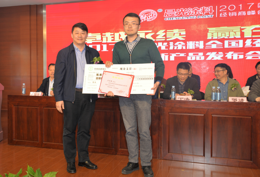 PA视讯在线官网在奖励先进方面,从来都以大手笔著称,2016年年度第一重量级奖项——销售金奖被苏州昆山分公司丁辉先生摘夺,现场由缪国元董事长亲自授予现金支票50万元,在获奖感言中,丁辉先生表达了自己的激动心情,立志2017年再拼搏,再赢大奖。作为粘结剂的优秀代理商,南京分公司区域总代叶顺旺先生受邀登台发表感言,他坚信肯吃苦、能创新,想客户所想,不满足当下所取得的业绩,就会获得回报,并与在场的同仁们相约2017携手再创业绩新高。